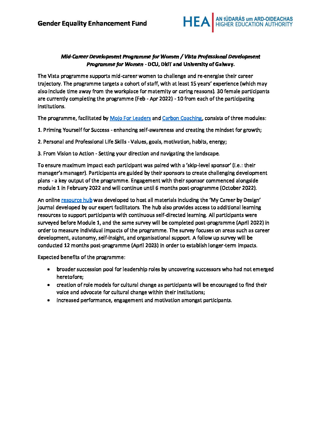 • 2020 DCU Mid-Career Development Programme for Women – Vista Professional Development Programme for Women