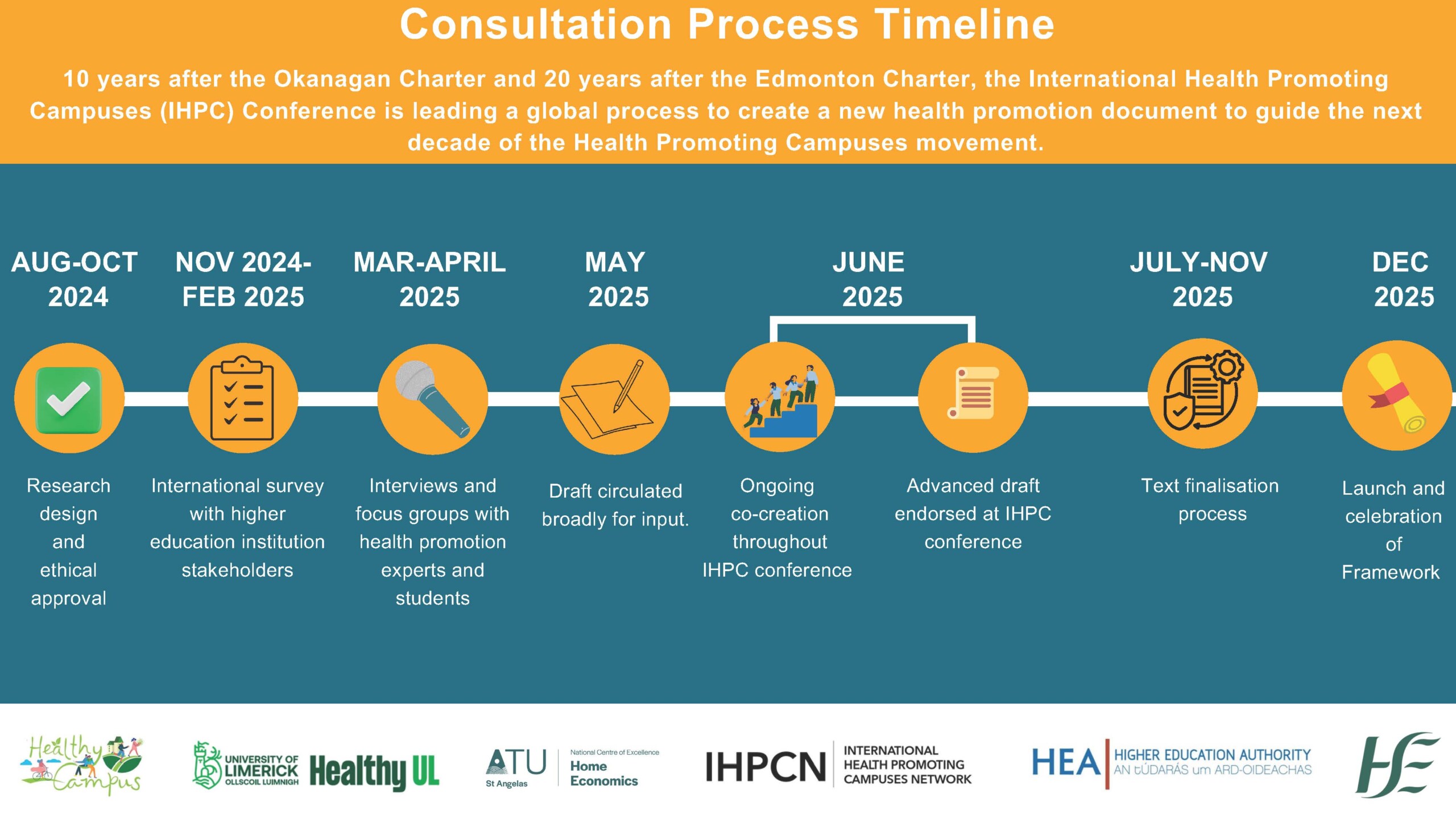 This timeline outlines the key phases in the development of the Limerick Framework for Action. The process began with establishing an international working group, creating a design protocol, and obtaining ethical approval. This was followed by data collection through an international consultation survey, interviews, and focus groups with health promotion experts and students. The insights gathered directly informed the draft of the Limerick Framework for Action, which was circulated broadly for consultation prior to the 2025 International Health Promoting Campuses (IHPC) conference. Further consultation was sought during the 2025 International Health Promoting Campuses conference from conference attendees. After the conference, the text of the Limerick Framework for Action was finalised and officially launched at the end of 2025.