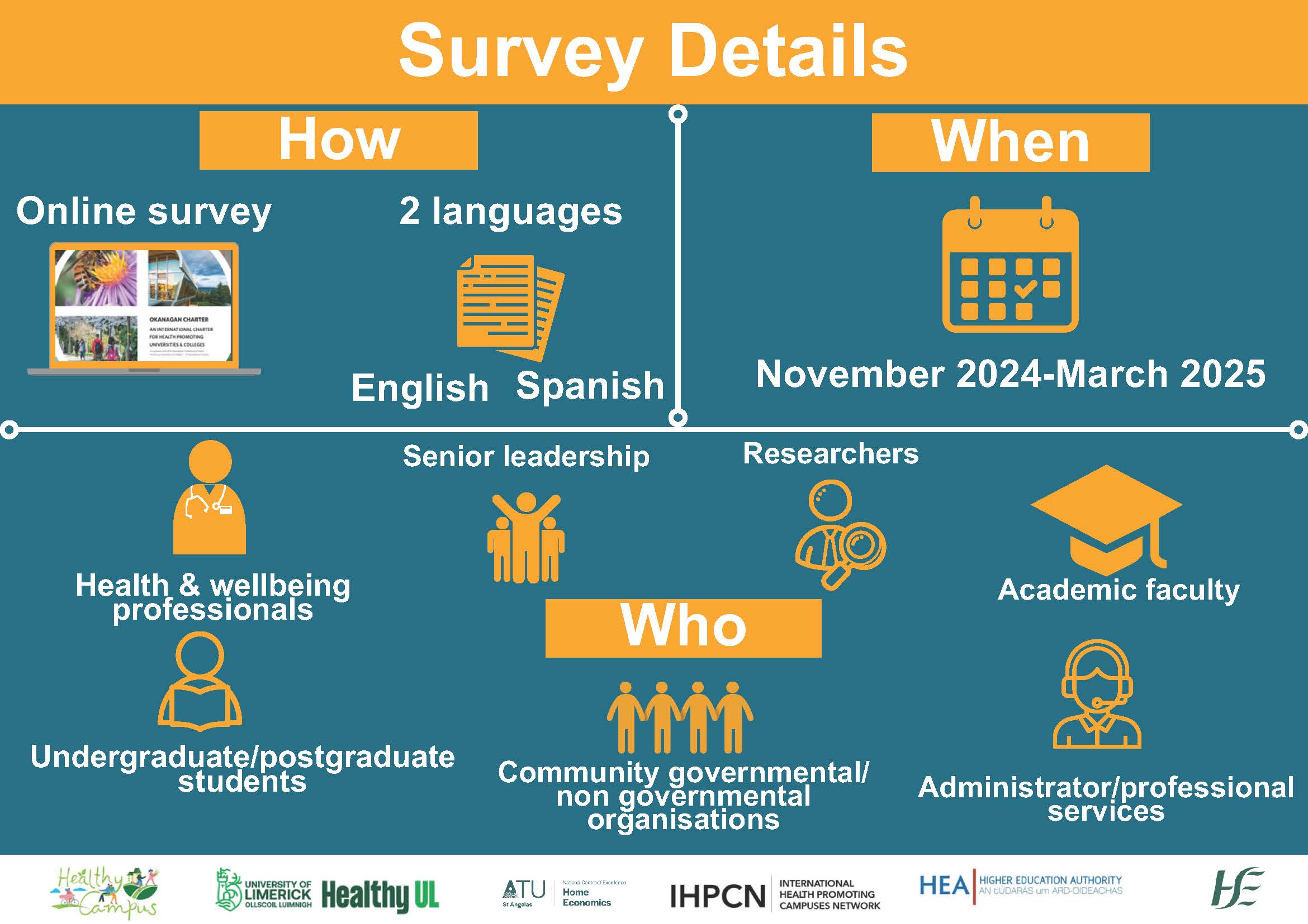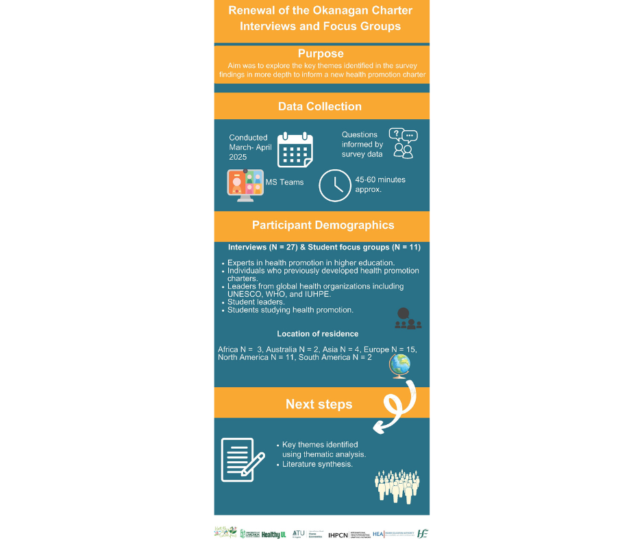 The international consultation survey was conducted online between November 2024 and March 2025 and was available in English and Spanish. The aim of the survey was to establish whether the Okanagan Charter should be revised, renewed, or remain the same. It targeted a diverse range of stakeholders, including students, faculty, researchers, senior leadership, health and wellbeing professionals, administrators, and representatives from community and governmental organisations.