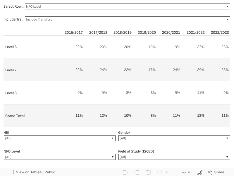 The following interactive table allows the user to select the row variable from the “Select Row Variable (Progression)” dropdown: NFQ Level, Field of Study or HEI. The user can also apply filters from the dropdown menus below the table. For comparison with previous years non-progression analyses, the user can select “Do not include transfers” from the “Include Transfers?” drop-down menu.