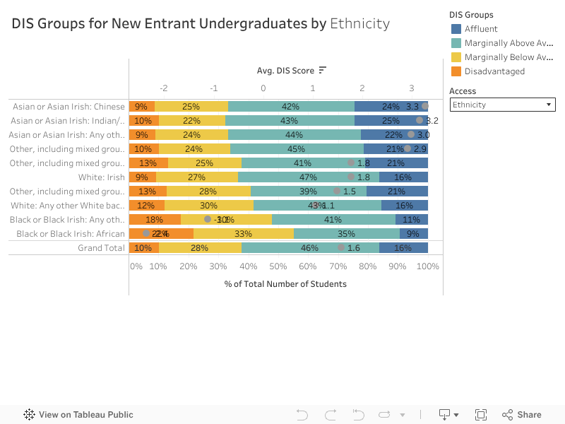 when reviewing by Ethnicity, the Ethnicity with the highest average DIS Score was Asian or Asian Irish: Chinese, with an average DIS Score of 3.3. Within this group 24% of students had an Affluent home addresses. The second most affluent group was Asian or Asian Irish: Indian/Pakistani/Bangladeshi, with an average DIS Score of 3.2 with 25% of Students being Affluent.