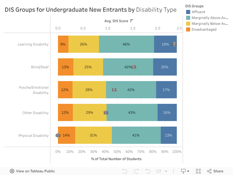 Across the period 2021/22 to 2023/24, of the disability categories on the Access Survey students who report a learning disability had the highest average DIS Score at 2.3 65% of these students were from a Marginally Above Average or Affluent area (19% Affluent and 46% Marginally Above Average). This was followed by Blind/Deaf students who had an average DIS Score of 1.5