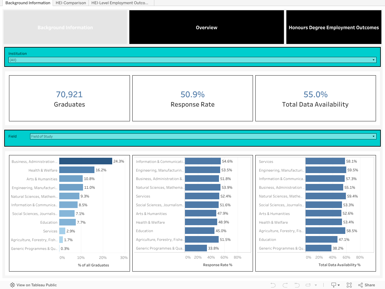 - 3. HEI-Level Information (UG Honours Degree): This looks at employment outcomes for undergraduate honours degrees for each HEI